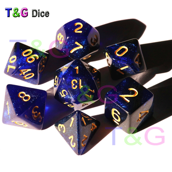 新着!ユニバースギャラクシーダイスセットD4-D20、ロイヤルブルーミックスブラックカラー、日光の下でシニーグリッター効果DND用クール